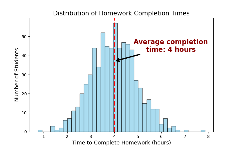 Figure 1: The distribution of homework completion times. The x-axis represents the hours taken to complete the homework, the y-axis shows the number of students who finished within each time frame. The average completion time is 4 hours and is marked by the red vertical dashed line.