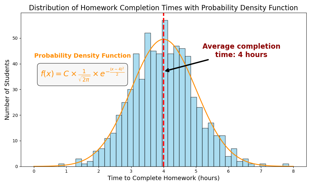 Figure 4: The distribution of homework completion times with normal distribution curve. The orange curve corresponds to the normal distribution curve which is the same as Probability Density Function with mean 4 and standard deviation 1 scaled by a scaling factor (C).