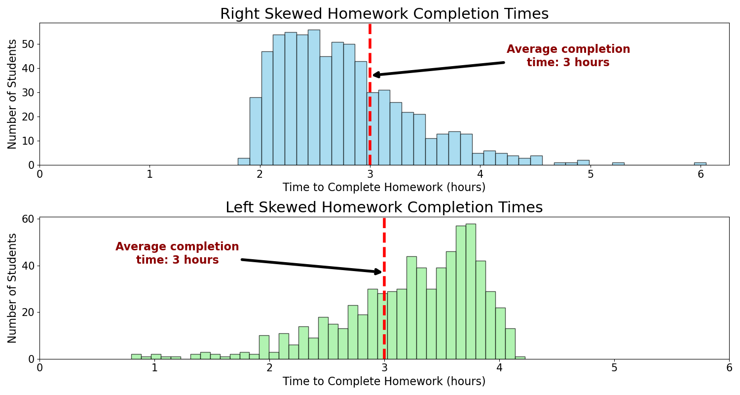 Figure 2: The skewed distribution of homework completion times. The first plot is a right-skewed distribution. The second plot is a left-skewed distribution.